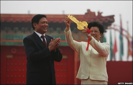 Bà Chen được trao chiếc chìa khóa vàng tượng trưng từ tay Chủ tịch Ủy ban Tổ chức Olympics Trung Quốc Lưu Kỳ