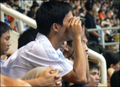Ngồi tít ở trên tầng cao, cổ động viên này phải sử dụng cả ống nhòm để theo dõi trận đấu.