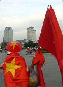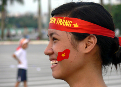 Dịch vụ ăn theo trận đấu quanh sân vận động. Rất nhiều người với mũ, nón và quốc kỳ Việt Nam.