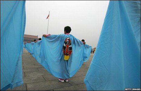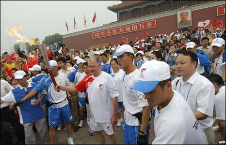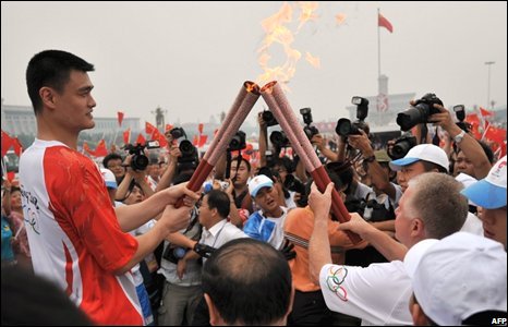 Vận động viên bóng rổ nổi tiếng của Trung Quốc, Yao Ming, người cao 2m28, rước đuốc qua quảng trường Thiên An Môn.