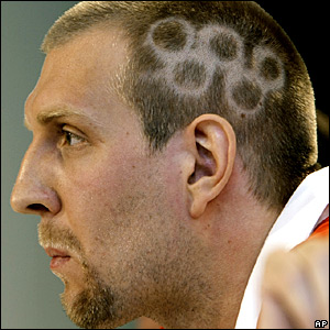 Ngôi sao Dirk Nowitzki của đội bóng rổ Dallas Mavericks khoe 'đầu mới' khi anh chuẩn bị cầm cờ Đức tại lễ khai mạc.