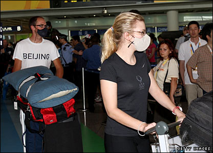 Các thành viên của đội tuyển Mỹ tỏ ra không khoan nhượng với bầu không khí Bắc Kinh khi họ tới phi trường.
