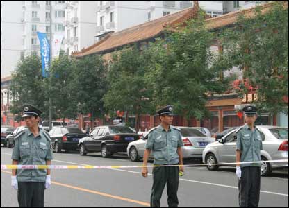 Chỉ cách vùng Olympics vài trăm mét là khu vực nhà dân và khu buôn bán. An ninh khép chặt tại đây.