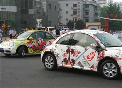Một đoàn xe con, có vẻ có chủ nhân là người giàu mới nổi, diễu qua trên đường phố. Toàn thân xe được trang trí riêng chủ đề Olympics.