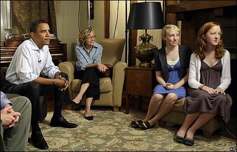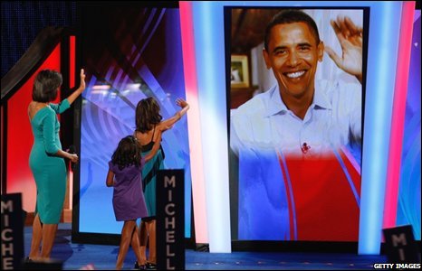 Hai cô con gái, Sasha và Malia, cùng mẹ vẫy chào cha, người nói chuyện qua đường truyền video tại nhà của ủng hộ viên ở Missouri.