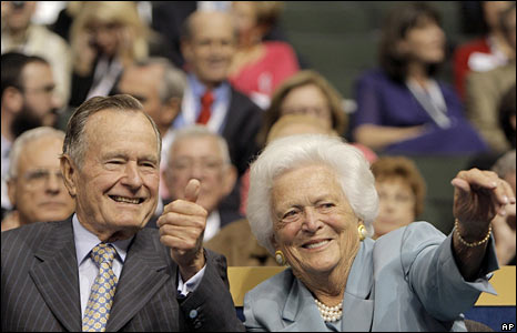 Cựu Tổng thống Bush cha và phu nhân, Barbara, cùng chia sẻ không khí vui mừng bên trong trung tâm Xcel Energy, nơi diễn ra đại hội.