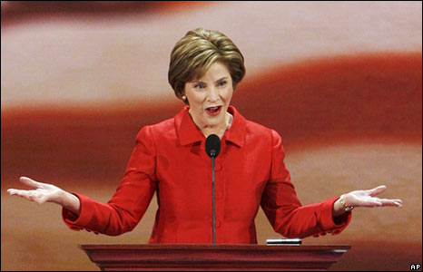 Đệ nhất phu nhân Hoa Kỳ, Laura Bush, là một trong những người phát biểu đầu tiên sau khi đa phần các sự kiện trong ngày đầu phải hủy vì cơn bão Gustav.