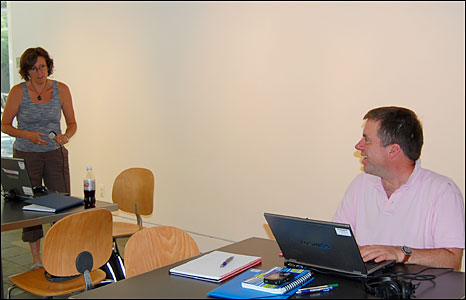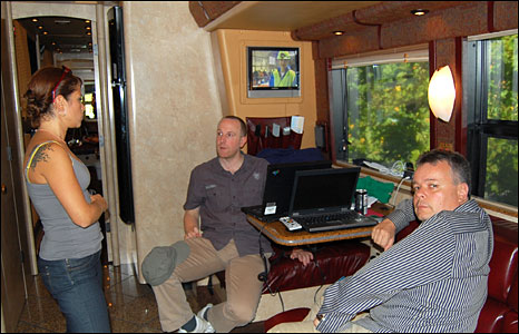 Bên ngoài xe bus, trong sảnh đường sẽ diễn ra chương trình lớn với nhiều khách mời, Steve Titherington, lãnh đạo phụ trách toàn bộ hành trình xe bus và là phó phòng tin BBC Thế giới vụ, đang bàn bạc với biên tập viên Katie Dahlstrom.