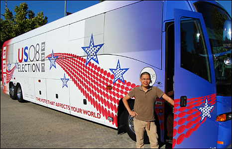 Đây là chiếc xe bus sẽ chở các phóng viên của BBC đi tìm hiểu nước Mỹ nhân dịp chuẩn bị bầu cử Tổng thống. Chiều 9/9, tôi được gọi về họp mặt tại Los Angeles để chuẩn bị bắt đầu hành trình vào hôm sau.
