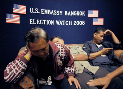 Các nhà báo Thái Lan ngồi chờ kết quả bầu cử tổng thống Mỹ tại Sứ quán Mỹ ở thủ đô Bangkok. Chênh lệch múi giờ khiến công việc theo dõi bầu cử trở nên khá mệt nhọc.