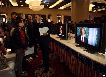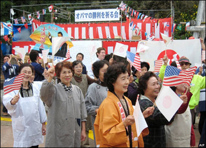Người dân vùng Obama tại Unzen, miền Tây Nam Nhật Bản, xem kết quả bầu cử tổng thống Mỹ trên truyền hình. Băng-rôn của họ có dòng chữ "Nhóm cầu nguyện cho Obama chiến thắng".