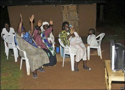 Họ hàng xa của ông Barack Obama tại làng Kogelo, Kenya, hò reo trước kết quả bỏ phiếu. Người vợ hai của ông nội ông Obama hiện vẫn sống tại làng này.
