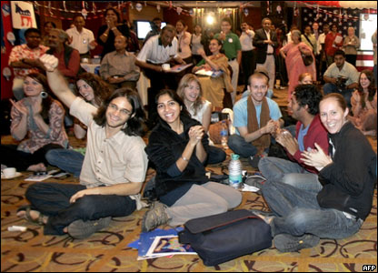 Công dân Mỹ tại Ấn Độ tập trung tại một khách sạn ở Kolkata để theo dõi bầu cử. Đảng cầm quyền Ấn Độ hoan nghênh chiến thắng của ông Obama vì "nhiệt huyết trẻ trung của ông" cũng giống như tốc độ phát triển của nước Ấn.