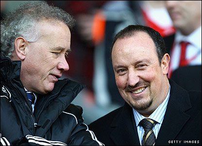 Liverpool v Bolton: Giám đốc Rick Parry đang nói đùa với HLV Rafa Benitez trong lúc chờ giờ đấu