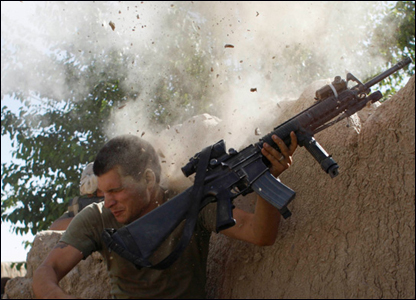 Một lính thủy quân lục chiến Mỹ bị chiến binh Taliban bắn đáp trả gần Garmser ở tỉnh Helmland, Afghanistan, hồi tháng Năm. Binh sĩ này không bị thương. Cuối năm 2008, cả Mỹ và Anh đều cân nhắc gửi thêm quân tới nước này.