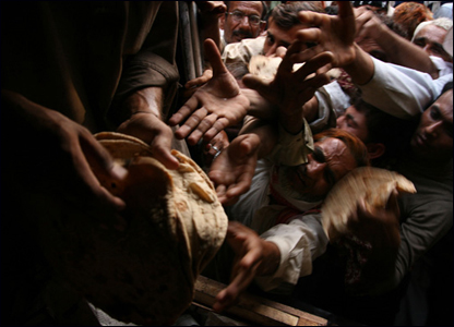 Giá lương thực tăng cao khiến những nhu yếu phẩm như gạo, ngô và dầu nấu ăn trở nên đắt đỏ với nhiều người trên toàn thế giới. Tại Lahore, Pakistan, người dân tranh giành nhau bánh mỳ.