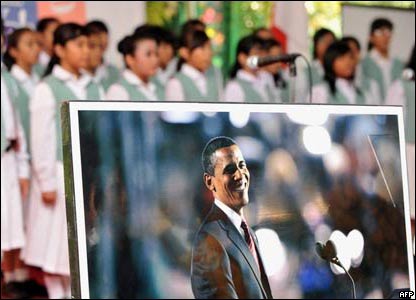 Trước đó mấy tiếng, các em học sinh từ trường mà ông Obama đi học hồi nhỏ ở Jakarta, Indonesia trong thập niên 1960, hát tại một buổi lễ đánh dấu ngày ông lên cầm quyền.