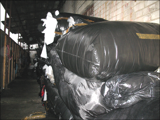 Hành lang vào xưởng chứa đầy những miếng lót áo đông còn thừa cùng những dây quần áo của công nhân.