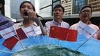 • Người biểu tình giơ cao mô hình đảo Điếu Ngư cắm cờ Trung Quốc, ngay bên ngoài lãnh sự quán Nhật Bản ở Hong Kong.
