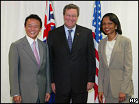 Bộ trưởng ngoại giao Mỹ Condoleezza Rice và các bộ trưởng ngoại giao Úc và Nhật tại hội đàm an ninh ở Úc đã bày tỏ quan ngại cao độ trước chương trình hạt nhân của Iran. Trong một thông cáo chung sau hội đàm an ninh ba bên, ba vị bộ trưởng kêu gọi Iran ngừng các hoạt động làm giàu uranium và quay lại đàm phán. Mỹ đã cáo buộc Iran là chế tạo vũ khí hạt nhân nhưng nước này phủ nhận cáo buộc này. Phát biểu trước đó trong chuyến thăm tới Úc, bà Rice đã kêu gọi củng cố quan hệ giữa Nhật và Trung quốc. 'Cùng hành động' Bà Rice cùng bộ trưởng ngoại giao Úc Alexander Downer cùng bộ trưởng ngoại giao Nhật Taro Aso cho biết họ đã bàn thảo về sự cần thiết của việc Hội đồng bảo an Liên hiệp quốc cùng hành động để thuyết phục Iran "ngay lập tức chấm dứt" các hoạt động làm giàu uranium. Ba vị thúc giục Iran quay trở lại đàm phán với Cơ quan Năng lượng Nguyên tử Quốc tế của Liên hiệp quốc (IAEA) và tuân thủ các đòi hỏi của cơ quan này. Hội đồng bảo an hiện đang bàn bạc để quyết định hành động đối với Iran, sau nhiều tháng căng thẳng về chương trình hạt nhân của nước này. Ba vị bộ trưởng cũng kêu gọi Bắc Hàn quay lại đàm phán hạt nhân sáu bên "ngay lập tức và vô điều kiện." Cuộc đàm phán sáu bên này có sự tham gia của Bắc Hàn, Nam Hàn, Trung quốc, Nhật bản, Nga và Mỹ, dường như đã đạt được bước tiến đáng kể hồi tháng 9 năm ngoái khi Bắc Hàn đồng ý từ bỏ chương trình hạt nhân để đổi lấy các đảm bảo về viện trợ và an ninh. Tuy nhiên, từ đó đến nay chưa có tiến bộ nào đạt được trong việc thực hiện thỏa thuận đó. | |||||||||||||||||||||||||||||||||||||||||||||||||||||||||||||||||||||||||||||
