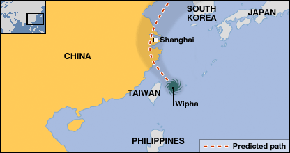 Chừng 200 ngàn người đang được đưa đi sơ tán khỏi Thượng Hải, thành phố tài chính của Trung Quốc, để tránh trận bão lớn đang tiến vào vùng duyên hải phía đông đất nước. Những người dân sống trong khu vực dễ bị ảnh hưởng nhất của thành phố đang được chuyển tới các lều trại tạm trước khi bão Wipha đổ vào. Các nhà dự báo thời tiết nói rằng trận bão, dự kiến sẽ tràn vào vào đầu giờ sáng Thứ Tư, có thể sẽ là trận bão tồi tệ nhất trong cả một thập niên qua. Các trận mưa và gió do bão Wipha đã tấn công vào Đài Loan, buộc các trường học và các công sở phải đóng cửa, trong lúc các chuyến bay đều phải hạ cánh tránh bão. Tin cho hay đã có một người thiệt mạng khi giàn giáo tại một công trường xây dựng bị đổ tại thủ đô Đài Bắc. Đang mạnh thêm Hãng tin Tân Hoa Xã nói Thượng Hải và các tỉnh duyên hải Chiết Giang và Phúc Kiến ở phía nam đều đã ra các cảnh báo về bão. Các chuyên gia nói rằng cơn bão vốn đang mạnh dần lên khi tiến gần vào đất liền, có thể sẽ gây mưa tới mức 200mm với sức gió hơn 150km/h. Tính tới chiều Thứ Ba, thành phố Thượng Hải đông dân đã bị mây che dày đặc trong lúc mưa lớn tiếp tục kéo dài từ đêm hôm trước, phóng viên BBC Quentin Sommerville đang có mặt tại chỗ nói. Thế nhưng các đường phố vẫn nhộn nhịp, các trường học và công sở vẫn hoạt động bình thường. Các quan chức phòng chống lụt bão ở tỉnh Chiết Giang láng giền cũng đã thúc giục người dân chuẩn bị đi tránh bão, kiểm tra các hồ chứa nước và phải cảnh giác trước khả năng có lũ quét và đất truồi. Truyền thông quốc gia nói các tàu thuyền được lệnh phải về cảng trước khi bão tới trong lúc các tuyến phà hiện đã tạm ngưng hoạt động. Cơn bão gây chết người tồi tệ nhất tràn vào vùng duyên hải Trung Quốc trong những năm gần đây là Bão Winnie hồi năm 1997, làm chết 236 người. ĐƯỜNG ĐI DỰ KIẾN CỦA BÃO WIPHA