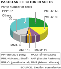 Hai đảng lớn nhất có lập trường trung dung tại Pakistan đã đồng ý sẽ đứng ra thành lập chính phủ. Đảng Nhân Dân Pakistan (PPP) dưới sự lèo lái của bà Benazir Bhutto cho tới khi bà bị ám sát và đảng có tên gọi là Liên Minh Hồi giáo Pakistan, (PMLN) của cựu thủ tướng Nawar Sharif đã giành được nhiều phiếu nhất trong cuộc tổng tuyễn cử đuợc tổ chức hôm thứ Hai. Sau cuộc đàm phán với ông Sharif, tân đồng chủ tịch của đảng Nhân dân Pakistan, là chồng góa của bà Bhutto, ông Asif Zardari, nói rằng họ muốn thành lập một chính phủ dựa trên tinh thần đồng thuận, nhưng không có các tổ chức thân tổng thống Musharraf. Ông Sharif nói rằng ông Zardari và ông đã đồng ý lập lại các quan tòa thâm niên mà đã bị Tổng thống Musharraf bãi nhiệm. Trước đó, ông Asif Ali Zardari, chồng của bà Bhutto đã mất, đồng thời là người kế vị chức chủ tịch đảng, đã đe doạ là sẽ có các vụ xuống đường phản đối nếu xảy ra việc gian lận phiếu bầu.