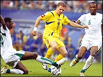 Ukraine sau khi bị Tây Ban Nha hạ đo ván nay đã tỏ ra trên chân hẳn đội Saudi Arabia. Ukraine đã mở tỷ số trước ở phút thứ tư khi thủ môn Mabrouk Zaid vô ý để cho Ukraine được hưởng một quả phạt góc và Andriy Rusol không bỏ cơ hội ghi bàn. Cũng chinh thủ môn Zaid đã trượt chân khi cố bắt một đường bóng của Serhiy Rebrov từ 35 mét. Maxim Kalinichenko đã tạt một đường bóng để Andriy Shevchenko đánh đầu ghi bàn thứ ba cho Ukraine ngay sau khi hai bên nghỉ giải lao và Shevchenko đã đưa một cơ hôi bằng vàng cho Kalinichenko ghi bàn thứ tư. Cũng có ý kiến cho rằng sân Hamburg có phần trơn trợt cho nên đội Saudi Arabia khá chật vật trong lúc Ukraine cảm thấy khá thoải mái trên sân này và giao trả bóng khá gắn bó. Với trận thắng này, hy vọng của Ukraine lọt vào vòng trong sáng trở lại và nếu như họ thắng Tunisia ở trận cuối, thì họ sẽ tiến vào vòng đấu loại trực tiếp. ------------------------------------------------------------------------------- Saudi Arabia: Zaid, Dokhi (Khathran 55), Tukar, Al Montashari, Sulimani, Al Ghamdi, Ameen (Mouath 55), Noor (Al Jaber 77), Khariri, Aziz, Al Kahtani. Dự bị : Al Anbar, Al Bahri, Al Daeyea, Al Harthi, Al Qadi, Al Temyat, Khojah, Massad. Thẻ vàng : Dokhi, Al Ghamdi, Khariri. Ukraine: Shovkovskiy, Nesmachniy, Rusol, Sviderskiy, Tymoschuk, Shelayev, Gusev, Rebrov (Rotan 71), Kalinichenko, Shevchenko (Milevskiy 85), Voronin (Gusin 79). Dự bị: Yatsenko, Yezerskiy, Byelik, Chigrynskiy, Nazarenko, Pyatov, Shust, Vorobey. Thẻ vàng : Nesmachniy, Kalinichenko, Sviderskiy. Bàn thắng: Rusol 4, Rebrov 36, Shevchenko 46, Kalinichenko 84. Khán giả : 50,000. Trọng tài: Graham Poll (Anh Quốc). | ||||||||||||||||||||||||||||||||||||||||||||||||||||||||||||||||||||||||||||||||