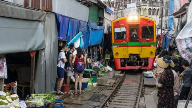 Ngoài phố cà phê đường tàu Hà Nội đã bị đóng cửa, ở châu Á còn có nhiều địa điểm du lịch gắn với đường tàu hấp dẫn khách du lịch từ khắp nơi trên thế giới. Một trong số đó là khu chợ địa phương Maeklong của Thái Lan, cách thủ đô Bangkok 80km về phía Tây Nam.