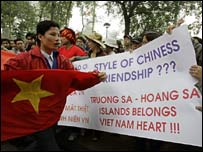 “Nếu không có luật pháp và trật tự quốc tế, cá lớn sẽ nuốt cá bé, cá bé sẽ nuốt tôm tép, chúng tôi sẽ không tồn tại nổi.” Còn Đại sứ Hoàng Chí Trung hôm 10.12 thì cho rằng Công ước về Luật biển của LHQ (UNCLOS) đã "tạo ra trật tự quốc tế trên biển và đại dương, góp phần tăng cường hoà bình, an ninh, hợp tác và quan hệ hữu nghị giữa các quốc gia". Như vậy, một trật tự chung là điều Việt Nam đang hướng tới rất có thể vì các thỏa thuận, đàm phán song phương- vốn là một chiến lược của Trung Quốc- đã không đem lại lợi ích gì cho Việt Nam. Giới quan sát tại Hà Nội cho BBC hay rằng một "thông lệ" đã xảy ra trong quan hệ với Trung Quốc là trong lúc, hoặc ngay sau khi có các chuyến thăm cao cấp của lãnh đạo Việt Nam, phía Trung Quốc liền có các động thái trên biển khiến Việt Nam lo ngại. Các nhà quan sát Phương Tây cũng nhận định rằng chủ nghĩa dân tộc Trung Hoa được đảng Cộng sản Trung Quốc khơi dậy chỉ nhắm vào Hoa Kỳ và Phương Tây trên mặt trận kinh tế, thì có nguy cơ nhằm ngay vào các nước láng giềng như Nhật Bản, Đài Loan và Việt Nam về mặt an ninh và lãnh thổ. | CÁC BÀI LIÊN QUAN ‘Biểu tình làm tổn hại quan hệ'11 Tháng 12, 2007 | Việt Nam Biểu tình 9.12 nhìn qua các trang mạng10 Tháng 12, 2007 | Việt Nam Tư lệnh Thái Bình Dương Mỹ thăm VN10 Tháng 12, 2007 | Việt Nam Biểu tình phản đối Trung Quốc09 Tháng 12, 2007 | Việt Nam Lời kể ngư dân bị tàu Trung Quốc bắn23 Tháng 10 , 2007 | Việt Nam | ||||||||||||||||||||||||||||||||||||||||||||||||||||||||||||||||||||||||||||