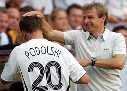 Huấn luyện viên trưởng Jurgen Klinsmann sung sướng chúc mừng Podolski đã thi đấu xuất sắc khi ông thay anh ra ở phút thứ 74