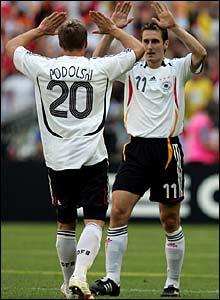 Podolski vui sướng cùng Miroslav Klose, người đóng vai trò quan trọng trong cả hai bàn thắng của anh
