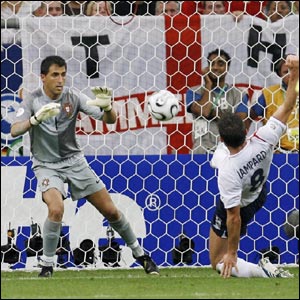 Ở đầu môn bên kia, Frank Lampard bỏ lỡ cơ hội đẹp nhất để Anh ghi bàn khi anh không kết thúc được cú chuyền mà Beckham tạt cho