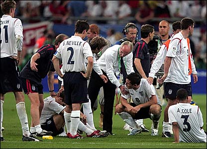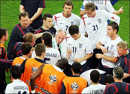 Ông Eriksson tập hợp đội quân đẫm mồ hôi của mình để dặn dò trước khi thi đấu hai hiệp phụ, trong khi các cổ động viên của Anh reo hò cuồng nhiệt