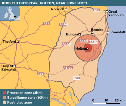 Giới chuyên gia Anh Quốc vẫn tiếp tục truy tìm nguồn lây đã đem dịch bệnh cúm gà vào hòn đảo, khiến trại gà ở Suffolk phải giết hàng trăm ngàn con gà Tây. Giới chăn nuôi đã giết gần 160.000 con gà Tây để dập tắt dịch bệnh được phát hiện ở khu Bernard Matthew, gần Lowestoft. Giới chức cho rằng nguy cơ lây nhiễm H5N1 sang cho người là "không đáng kể", nhưng lên kế hoạch phòng chống dịch cúm ở người. Thứ trưởng phụ trách nông thôn Ben Bradshaw nói ưu tiên trước mắt là khống chế và diệt trừ căn bệnh được coi là "có nguy cơ lây nhiễm cao" phát xuất từ virus cúm gà Á châu H5N1. Giới chức thú y nhận xét dòng virus phát hiện ở Anh giống với các ca tương tự ở ngỗng ở Hungary hồi tháng Một, và nghi ngờ chim hoang dã gieo rắc mầm bệnh. Tuy nhiên ông Bradshaw cho rằng Hungary khá xa, cho nên không thể loại trừ khả năng bệnh lây qua nguồn khác. Các xét nghiệm sẽ kéo dài nhiều tuần và giới chức không loại trừ khả năng sẽ không bao giờ biết được nguyên nhân chính xác. Hiện tại người ta thiết lập một vùng an toàn sinh học xung quanh trại gia súc ở Holton, cách Lowestoft 27km về hướng Tây Nam. Vùng cách ly có bán kính 3km và bên ngoài là vùng theo dõi với bán kính 10km. Các trại chăn nuôi trong một diện tích rộng hơn, chừng 2.000 cây số vuông, được khuyến cáo không cho gia cầm tiếp xúc với chim hoang dại. Bản đồ khu vực