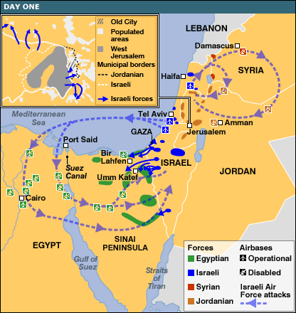Đánh phủ đầu: Israel tiến hành các vụ không tập vào các căn cứ quân sự của Ai Cập trước khi tiến hành tấn công trên bộ. Vào hồi 0745 giờ Israel, Israel tiến hành chiến dịch Focus và làn sóng những đợt không tập đầu tiên của Israel nhắm vào 11 sân bay của Ai Cập đã phá hủy hàng chục phi cơ đang đậu trên đường băng. Các cuộc tấn công phủ đầu này đã khiến Ai Cập rơi vào thế bị động và phòng không ở trong tình trạng bị những hạn chế. Hàng chục phi công của Ai Cập đã bị chết trong các cuộc không tập này của Israel. Không lực Israel - IAF - mất 19 phi cơ, khoảng 10% tổng lực của Israel, phần lớn là do trục trặc kỹ thuật hoặc bị tai nạn. Năm phi công của Israel đã bị chết và năm phi công khác bị bắt làm tù binh. Các nước Ả Rập đã phản công, với phi cơ của Syria, Jordany và Iraq tấn công vào các mục tiêu. Những làn sóng không tập của Israel đã phá hủy 311 chiếc phi cơ của Ai Cập. Israel ném bom các căn cứ của Syria, Iraq và Jordany và giành thế thượng phong về không lực trong suốt thời gian diễn ra cuộc chiến. Quân đội Israel đã vượt sang vùng Sinai, chiến Al Arish sau một ngày giao chiến dữ dội. Những đơn vị của Israel chiến được giao điểm Bir Lahfan và binh lính Ai Cập bị tấn công tại Umm Katef. Jordany tiến hành tấn công từ tây ngạn sông Jordan và miền đông Jerusalem và dùng súng tầm xa bắn phá Tel Aviv.
