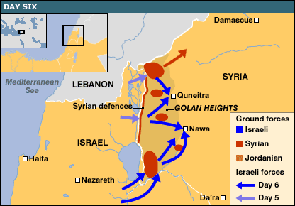 Lực lượng của Syria tại Cao nguyên Golan bị thất bại và một thỏa thuận ngưng bắn được chấp thuận. Tại mặt trận Syria, các lữ đoàn dù của Israel tiếp tục chiếm được Quneitra, cách thủ đô Damacus của Syria chừng 40 dặm và hầu như không gặp phải những kháng cự tại đây. Sức phòng thủ của Syria bị sụp đổ và lực lượng Syria rút về phía đông mà không tham chiến với lực lượng Israel. Tới 14.30h, lực lượng Israel chiếm được Cao nguyên Golan. Thỏa thuận ngưng bắn của Liên hiệp quốc bắt đầu có hiệu lực vào lúc 18.30h. Sau sáu ngày giao chiến, lực lượng Israel đã chiếm được toàn bộ bán đảo Sinai, tây ngạn sông Jordan, và Cao nguyên Golan. Vùng lãnh thổ nằm dưới sự kiểm soát của Israel tăng gấp bốn lần so với trước khi xảy ra cuộc chiến. Cho tới giữa tháng Sáu, con số người tị nạn Palestin tại Jordany lên từ 332.000 thành 745.000 người. Các nước Ả Rập có tham gia cuộc xung đột này không công bố các con số tử vong chính thức của quân đội. Israel nói 776 binh lính của Israe đã bị chết trong cuộc chiến. Theo hãng thông tấn AP, thì khoảng 11.500 người Ai Cập, 6.094 người Jordany và 1.000 người Syria đã bị thiệt mạng. Hàng ngàn người khác bị bắt làm tù binh trong cuộc xung đột kéo dài sáu ngày này.