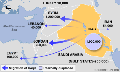 Nói chuyện với BBC, Thứ trưởng Ngoại giao Iraq Mohamed Ahmoud nói vấn đề người tị nạn cần được giải quyết gấp: "Vấn đề hiện nay là có hai triệu người Iraq ở các quốc gia lân cận và chúng tôi đang cố gắng để các nước này giúp cho người dân có giấy tờ đi lại, được tới trường và giúp đỡ y tế. Chúng tôi cần sự giúp đỡ từ mọi nơi, từ Hoa Kỳ tới Liên Hiệp Châu Âu và các nước khác." Dịch vụ hạn chế Tại Jordan, các bệnh viện cung cấp thuốc miễn dịch miễn phí cho trẻ em Iraq, nhưng không có đầy đủ dịch vụ y tế. Các trường học nhà nước chỉ cho phép một số lượng ít ỏi trẻ Iraq đến học. Syria cung cấp nhiều dịch vụ hơn cho dân Iraq, nhưng ngay cả tại đó, Liên Hiệp Quốc nói chỉ một phần của hàng trăm ngàn trẻ em Iraq là được tới trường. Liên Hiệp Quốc hy vọng tìm được nhà ổn định cho tổng cộng 20.000 người Iraq lưu vong trước cuối năm nay. Mặc dù chính phủ Mỹ loan báo đầu năm nay rằng họ sẽ cho phép tối đa 7000 người Iraq vào Mỹ trước cuối tháng Chín, nhưng trong chín tháng qua, Mỹ chỉ cho vào 133 người vì các biện pháp an ninh chặt chẽ.