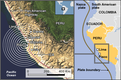 Các nhân viên cứu trợ làm việc qua đêm để tìm những người sống sót trong trận động đất kinh hoàng làm rung chuyển bờ biển của Peru. Khi họ cứu được người đàn ông còn sống ra khỏi một nhà thờ bị sập tại thị trấn Pisco, 24 giờ sau cơn địa chấn, nhiều người bỗng nuôi thêm hy vọng. Theo Sở Cứu hỏa Peru số người chết trong vụ động đất hôm thứ Tư, với độ rung chuyển đo được 8.0 độ richter, đã trên 500. Một loạt các cơn địa chấn sau động đất đã làm rung chuyển những vùng bị ảnh hưởng, gây lo sợ cho người dân. Vùng bị tai họa nặng nhất là hai thành phố ven biển Ica và Pisco, phía Nam của thủ đô Lima. Hàng chục ngàn người đã mất nhà cửa trong khi đường dây tải điện, viễn thông và giao thông đường bộ, đã bị gián đoạn nghiêm trọng. Nhà thương, nhà chứa xác tràn ngập nạn nhân và có lúc thi thể của những người tử nạn được xếp dọc theo đường phố.