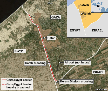 Các lực lượng an ninh Ai Cập đã bắt đầu can thiệp để cố gắng ngăn chặn dòng người Palestin từ giải Gaza thâm nhập qua biên giới vào Ai Cập. Cảnh sát chống bạo động của Ai Cập đã sử dụng vòi rồng để ngăn những người đang cố gắng vượt qua biên giới để lọt vào Ai Cập. Ai Cập công bố biên giới sẽ được đóng cửa vào lúc 13h00 (giờ GMT). Hàng trăm nghìn người Palestin đã băng qua biên giới Ai Cập để mua các hàng hoá nhu yếu phẩm kể từ khi các du kích quân làm vỡ một số lỗ thủng lớn ở biên giới Ai Cập hôm thứ Tư. Israel đã yêu cầu Ai Cập hành động vì nước này lo lắng về khả năng xảy ra các vụ mua bán vũ khí. Trong suốt đêm thứ Năm, quân đội Israel đã tiến hành hai vụ không kích gần biên giới, giết chết bốn người tình nghi là du kích quân Hamas. Các bác sĩ Palestin cho biết chỉ huy phái quân sự thuộc phong trào Hồi giáo tại Rafah, Mohammed Abu Harb, đã bị giết cùng với một chỉ huy du kích quân cao cấp khác khi các hoả tiễn của Israel bắn trúng chiếc xe díp của họ trong thành phố. Hai thành viên khác của nhóm du kích quân vốn đã kiểm soát Gaza vào tháng Sáu năm ngoái đã bị giết chết trước đó hai giờ đồng hồ, trong một vụ không kích của Israel vào một xe tải ở miền nam Rafah. Israel đã giết chết hơn 40 người Palestin ở Gaza trong 10 ngày qua cùng với việc thắt chặt phong toả vùng đất dọc bờ biển mà các du kích quân Palestin vẫn sử dụng để phóng hoả tiễn vào quốc gia Do Thái này. Liên hiệp quốc đã đưa ra con số tính toán rằng hơn 1,5 triệu người ở dải Gaza đã vượt qua biên giới Ai Cập từ ngày thứ Tư. Khu phố chính trên đất Ai Cập đã biến thành một chợ trời khổng lồ bán tất cả các loại hàng hoá, bao gồm nhiên liệu, dê, các con vật nuôi khác, các loại hàng hoá và thuốc lá.
