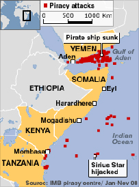 Một loạt các vụ cướp biển ngoài khơi của Somalia đã khiến cho các nước ven Hồng Hải phải họp khẩn để giải quyết vấn nạn này. Các viên chức cao cấp của các nước Ai Cập, Jordan, Ảrập Saudi và Yemen hiện đang gặp nhau tại Cairo, thủ đô của Ai Cập. Phiên họp này được triệu tập giữa lúc có tin nói rằng bọn cướp một chiếc tàu dầu của Ảrập Saudi hôm thứ Bảy đã đòi tiền chuộc là 25 triệu đôla. Tuy nhiên, một phát ngôn viên cho chủ nhân chiếc tàu này đã tỏ ý nghi ngờ về số tiền chuộc này, mà vấn đã được Pháp Tấn Xã AFP đưa tin. Chiếc tàu Sirius Star, tàu dầu lớn nhất cho tới nay bị cướp, hiện có chở theo hai triệu thùng dầu, tức là một phần tư sản lượng dầu của Ả Rập trong một ngày, trị giá hơn 100 triệu đô la. IChiếc tàu hiện đang thả neo ngoài khơi bờ biển Somalia với khoảng 25 thủy thủ đoàn bị bắt là con tin. Một tên cướp biển hiện có mặt trên chiếc tàu này, tự xưng là Mohamed Said đã thông báo cho AFP biết rằng chủ nhân của chiếc tàu này là công ty Vela International đã ấn định thời hạn chót là 10 ngày để giao tiền. Tên cướp biển này chỉ nói vắn tắt "Người Saudi có 10 ngày để tuân thủ bằng không hậu quả sẽ lường trước được". Một phát ngôn viên bộ Ngoại giao Ai Cập, Hossam Zaki, được thông tấn xã chính thức của Ai Cập (Mena news agency) trích thuật là đã nói rằng "tất cả các giải pháp còn để ngỏ" để cố giải quyết cơn khủng hoảng này. Hôm thư Tư, ngoại trưởng Ảrập Saudi đã xác nhận rằng chủ nhân của chiếc tàu này đang đàm phán với bọn cướp biển. Hai mươi lăm thủy thủ bị bắt làm con tin trên tàu Sirius Star gồm có 19 người Philipines, hai công dân Anh, hai người Ba Lan, một người Croatia và một người Ảrập Saudi. Chủ biên tiếng Somalia của đài BBC Yusuf Garaad nói rằng bọn cướp biển này được cho là thành viên của một tổ chức hết sức tinh vi với các đầu mối tại Dubai và các nước lân cận.. Ông nói thêm là phần lớn số tiền mà chúng có được từ các vụ cướp trước đây đã được dùng để mua tàu mới cùng võ khí và lập ra một mạng lưới khắp khu vực Sừng Phi Châu. Nga loan báo gởi thêm tàu chiếc tới vùng này để tiễu trừ bọn cướp biển.
