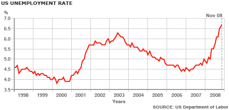 Bộ Lao động Hoa Kỳ cho biết các công ty Mỹ đã cắt giảm 533 ngàn việc làm vào tháng 11 - là đợt cắt giảm mạnh nhất trong 35 năm trở lại đây. Đây là chỉ dấu mạnh mẽ nhất cho thấy tình hình kinh tế tồi tệ thêm. Tỉ lệ thất nghiệp ở Mỹ giờ đã lên mức cao kỷ lục trong 15 năm, lên mức 6.7% so với 6.5% trong tháng Mười. Kể từ khi số liệu mới nhất này được đưa ra, công ty AT&T còn có đợt cắt thêm việc làm. Số liệu kinh tế yếu kém làm bùng thêm lo ngại là nền kinh tế lớn nhất thế giới sắp rơi vào tình trạng suy thoái trầm trọng kéo dài. Cục Nghiên cứu Kinh tế Quốc gia tuần này nói Hoa Kỳ thực ra rơi vào suy thoái từ tháng 12/2007. Trong một khảo sát khác, Viện Quản lý Chỉ số Cung ứng cho biết các hoạt động trong lĩnh vực dịch vụ tại Hoa Kỳ cũng ở mức thấp kỷ lục vào tháng 11. Lĩnh vực dịch vụ của Mỹ chiếm khoảng 80% các hoạt động kinh tế của nước này. Đây cũng là tháng thứ 11 mà Hoa Kỳ tiếp tục mất thêm công ăn việc làm. Triển vọng u ám Kinh tế Mỹ suy giảm ở mức 0.5% trong giai đoạn từ tháng Bảy đến tháng Chín, do chỉ số tiêu dùng giảm mạnh nhất trong 28 năm trở lại đây. Rất nhiều kinh tế gia cho rằng tổng sản phẩm quốc nội sẽ giảm mạnh hơn trong quý tư năm nay. Hôm thứ Tư, ban điều hành Cục Dự trữ liên bang đưa ra bức tranh u ám về nền kinh tế Mỹ trong bản phúc trình để xác định tỉ lệ lãi suất của Mỹ. Bản phúc trình này nói các hoạt động kinh tế trong hai tháng vừa qua đã yếu đi trên toàn nước Mỹ, đặc biệt với doanh số bán lẻ và bán xe hơi “giảm nghiêm trọng”.