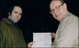 Timber for the cathedral's construction is known from documents to have come from as many as 16 different forests across Wiltshire and Hampshire as well as Herefordshire. Some trees were at least 300 years old when they were felled. One tree had a first ring date of AD 908. The dates established confirm that Salisbury, considered by many to be the epitome of Early English church architecture and the largest and most Complete 13th century masonry building in Britain, was built almost entirely to a single design. The first foundation stones were laid in AD 1220 and the whole cathedral was completed before its consecration in 1258 an astonishingly short time for such a structure. Tim Tatton Brown, consultant archaeologist to Salisbury Cathedral who has conducted extensive research into its history and initiated the dating project, said: "This very important new series of dates from dendrochronology has given us, for the first time, an independent sequence of dates for the whole of the cathedral." | | Dan Miles and Tim Tatton Brown |
