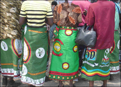 The team stopped at the town of Kaoma on their way west. A group of women dressed in chitenges branded with UDA colours and logos, dance and sing in support of the alliance's campaign.