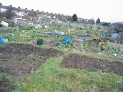 Another kilometre down the road, I pass the allotments. These are small plots of land that people, who don't have gardens, can rent from the local government. Allotments are becoming very popular in London now because more and more people want to grow their own.