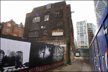 Even nearer to the financial centre stands this building, which at the time I saw it was being squatted. You can see the vast glass buildings of the various financial institutions rising up around it. It won’t be long before the wreckers move in to raise this one to the ground.