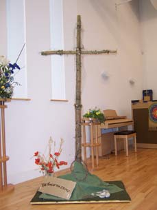 On Easter Sunday morning, during the service, some of the children come in with baskets of flowers. Everyone in the congregation is invited to come up, take one of the flowers and put it on the cross