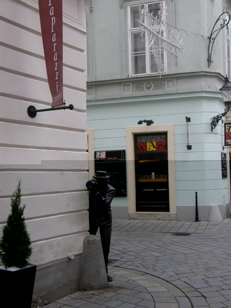 Paparazzi – as if alive, inquisitively looking around the corner in front of the restaurant of the same name