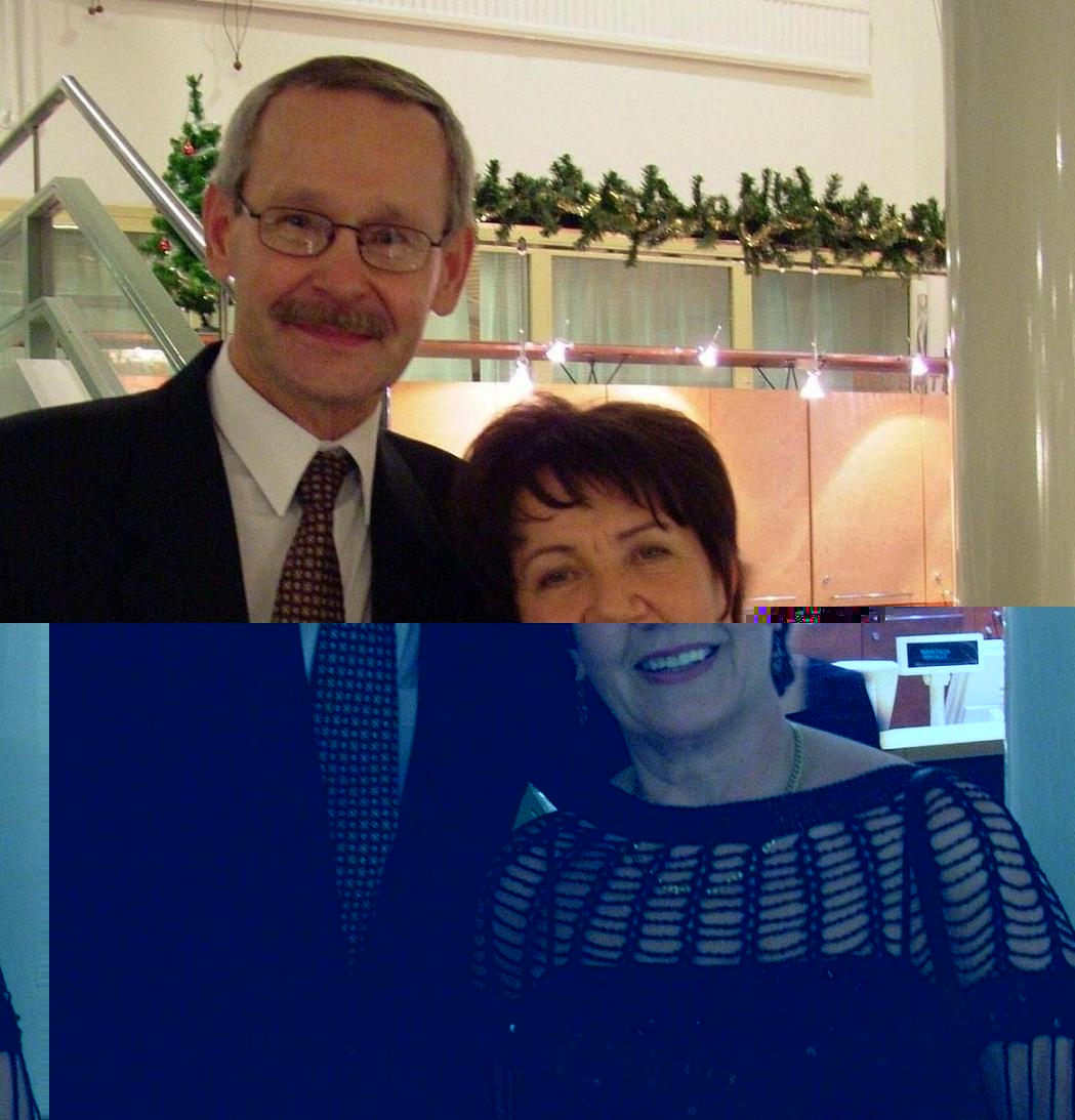 The photo from yesterday was really a tree covered with snow. Katri had taken the picture by the ski slopes in Lapland. This kind of phenomena is rather common during the winter; wet snow gets stuck on tree brunches and freezes… more snow and wind together harden the tree even more. The picture tonight is of me and my husband in a gala mood.