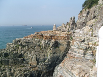 After having light breakfast, we headed to Taejongdae. I will show you some pictures of it. It’s a wonderful place to take a walk. Actually, I saw quite a lot of people walking up. From a distance it looks like a small mountain, but it is a cliff.