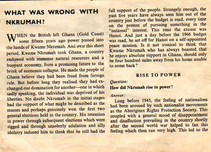 These are the pages of a pamphlet, "What was wrong with Nkrumah" published in 1972 by Ghana's state publishing corporation. This type of propaganda material was produced by the government of the day following Nkrumah's overthrow in 1966. Many thanks to Vera Kwakofi for the use of the pamphlet.